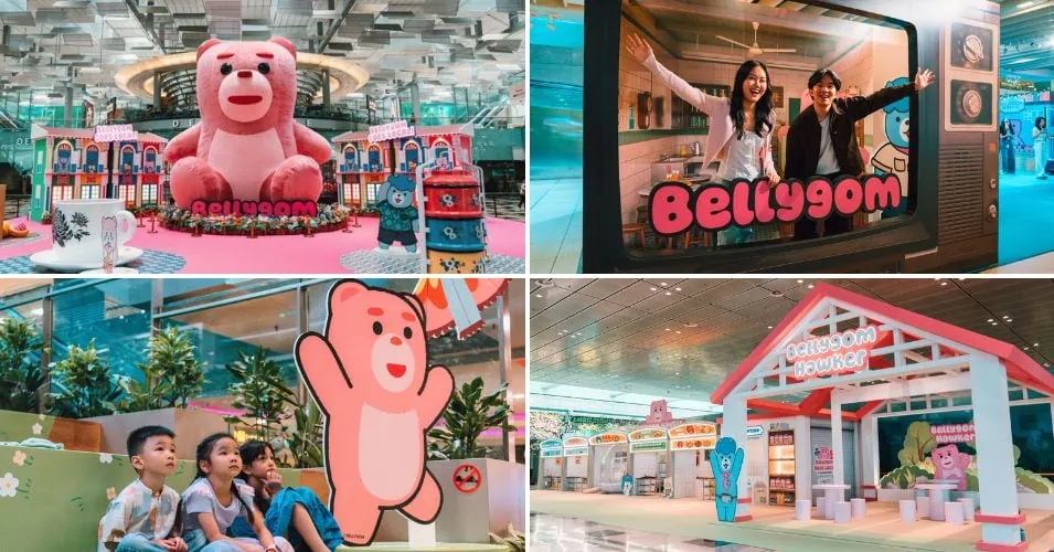 A huge pink bear resembling Lotso has landed in the middle of Changi Airport. With round black eyes, thick eyebrows, and shaped like a gummy bear, Bellygom and friends are making their rounds about the airport!
