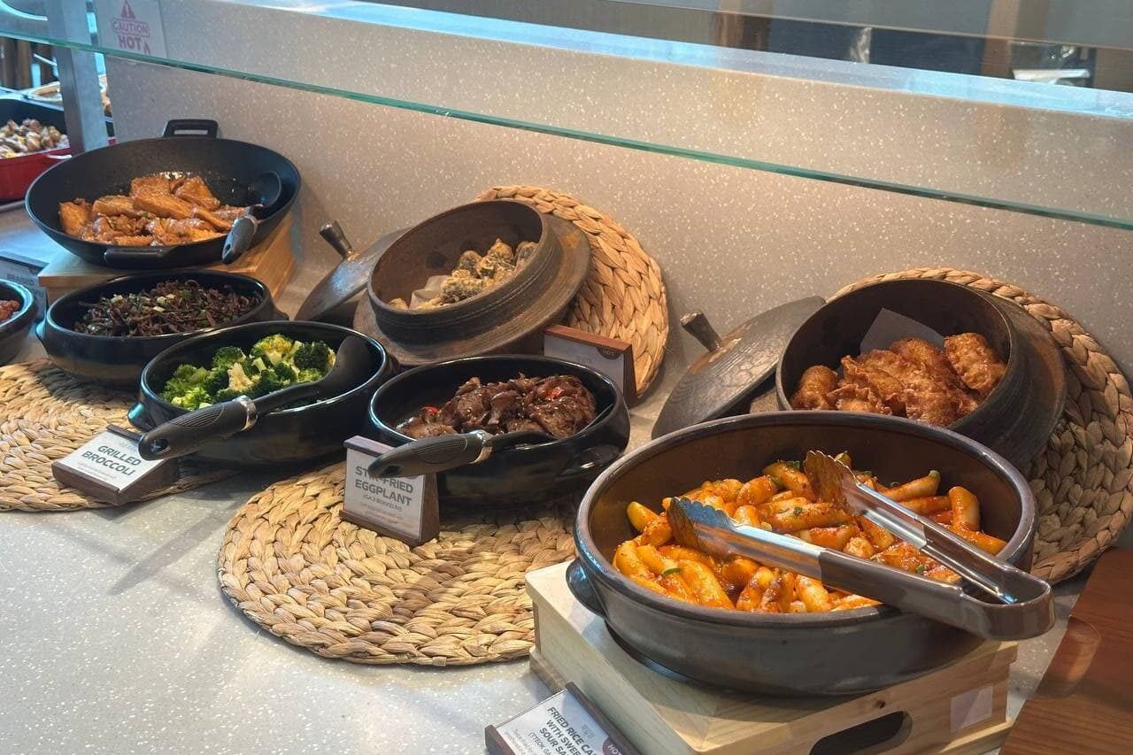 Apart from side dishes like greens, eggs, and meat, you’ll also find iconic Korean bunsik (snack food) items. Highlight items include kimmari (fried seaweed rolls), fried dumplings, tteokbokki, and more stir-fried goodness.