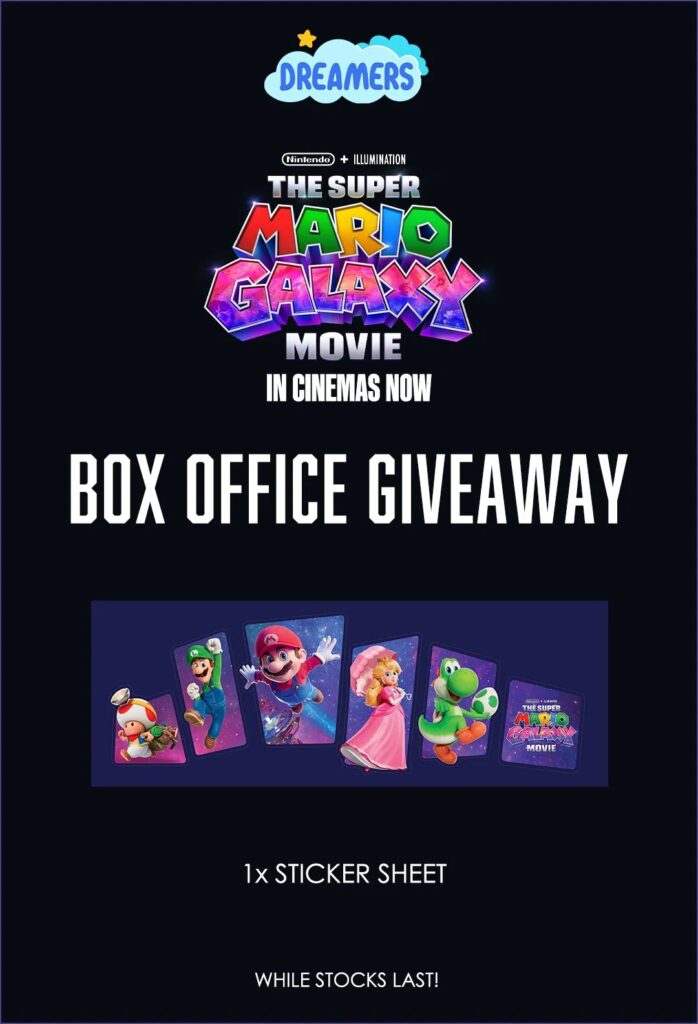 In light of the current The Super Mario Galaxy Movie screening, redeem a sticker sheet with 2 The Super Mario Galaxy Movie movie tickets purchased at Shaw Theatres LIDO Dreamers box office from 1 April 2026 onwards.