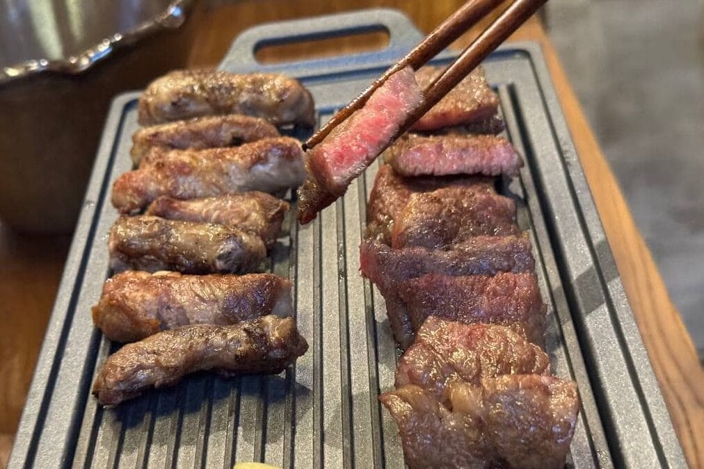 We opted for medium-rare Hanwoo (S$102 per 100g), and its beef truly delivered. Well-marbled and tender, this beef cut was the first to be finished. We also tried DRIM GOLD’s signature, DRIM Prime Cut (S$42 per 100g), made of iberico rib finger. When ordering the DRIM Prime Cut, it can toughen when you let it get cold, so we would recommend eating it right when served.