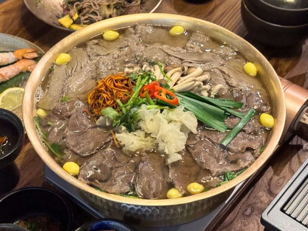 For something a little more wholesome, the Korean Beef and Vegetable Hotpot (S$138) reminds us of the ABC soup our parents used to cook in a crockpot. Its base soup, in particular, is actually galbi tang (beef soup) simmered over 24 hours, resulting in its clear broth. Thanks to the hotpot’s vegetables like white fungus, chives, and minari, you can expect a textured bite. Surprisingly, we didn’t feel the urge to eat this with rice, so if you are ordering other carb mains, those will be enough to fill you up next to the hotpot.