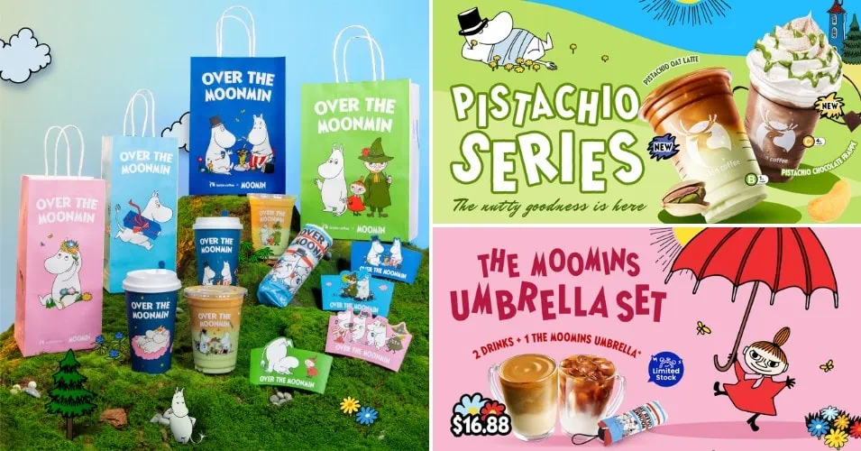 You can look forward to their Roasted Coconut Latte (S$6.80), which perfectly blends the intense espresso with the mellow flavours of toasted coconut. The pistachio series, which will launch on 19 March 2026, will feature a Pistachio Chocolate Frappe and Pistachio Oat Latte that are made with premium ingredients. Be sure to also look out for their adorable Moomin umbrella and post-its that come with the purchase of selected drinks.