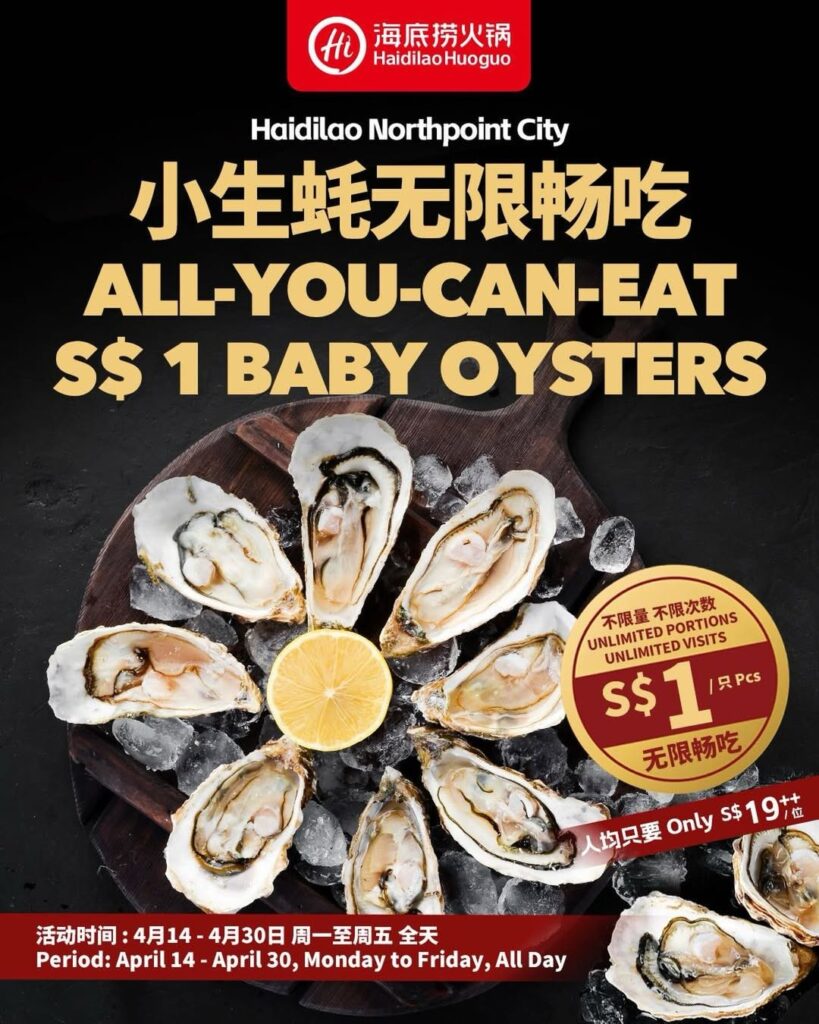 Nothing gets our taste buds partying quite like a juicy, plump oyster—and now, you can enjoy them to your heart’s content without worrying about the price tag. Haidilao Hot Pot is offering an all-you-can-eat baby oyster buffet for just S$1, with a minimum spend of S$19 per person.