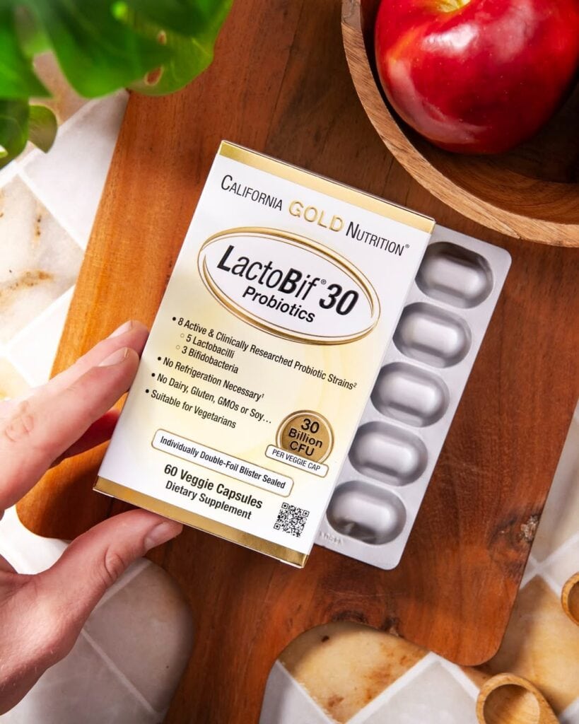 California Gold Nutrition’s LactoBif 30® probiotics contain eight active strains—five Lactobacillus and three Bifidobacterium—designed to support digestive balance, immune function, and occasional gut discomfort.