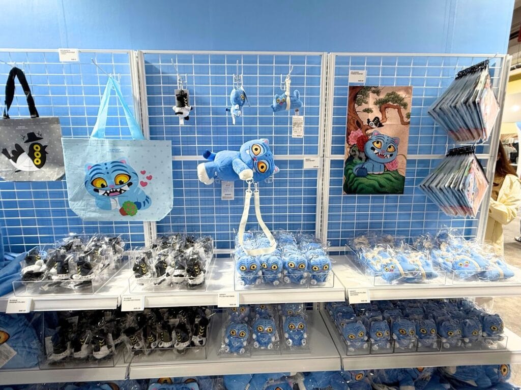 An unforgettable mascot of the show, Derpy Tiger, dominates nearly one-third of the space with bright blue. Presenting Derpy Tiger sling bags (S$59), pouches (S$24), blankets (S$64), and more—this cheeky tiger has been a constant bestseller since the pop-up opened.