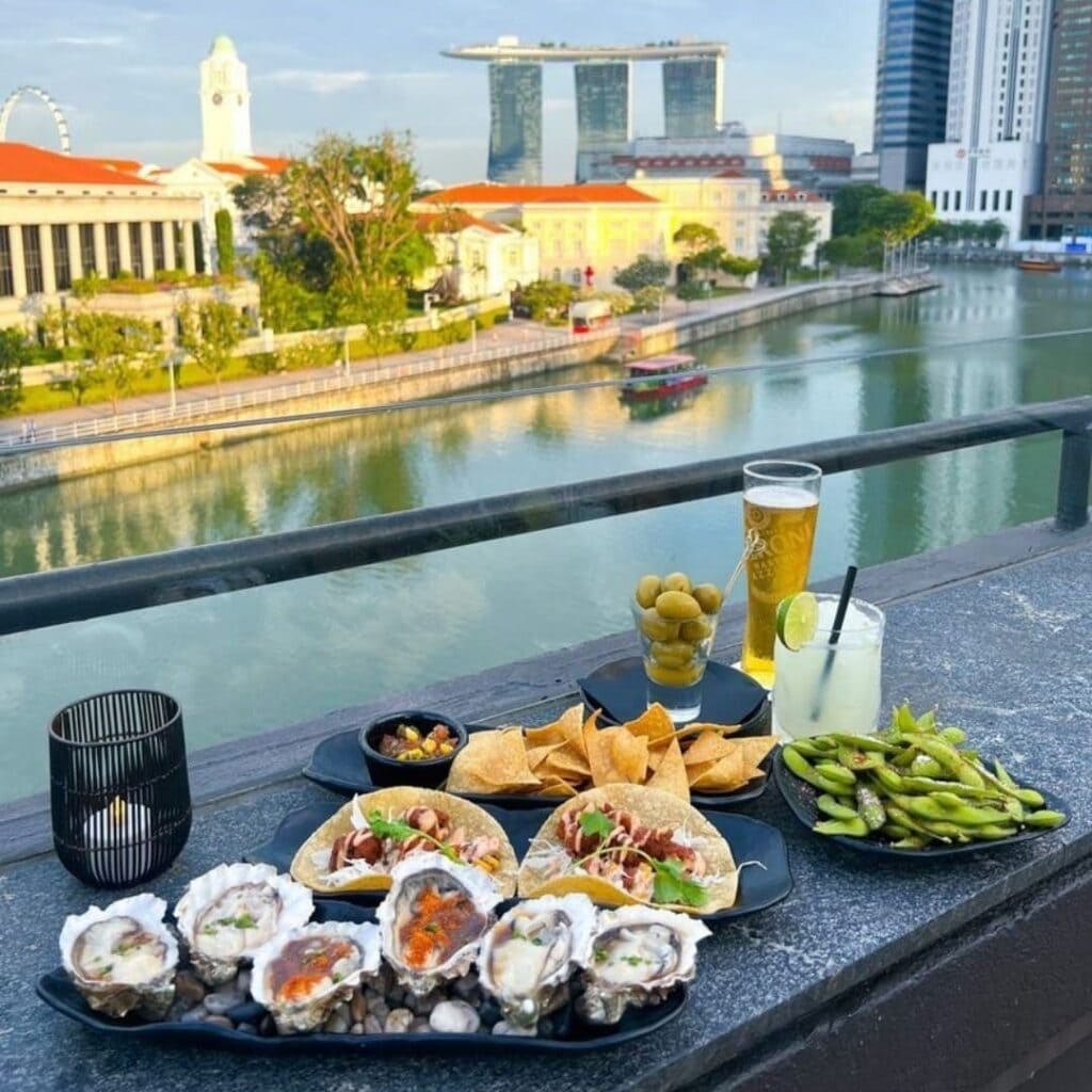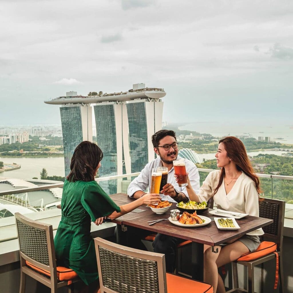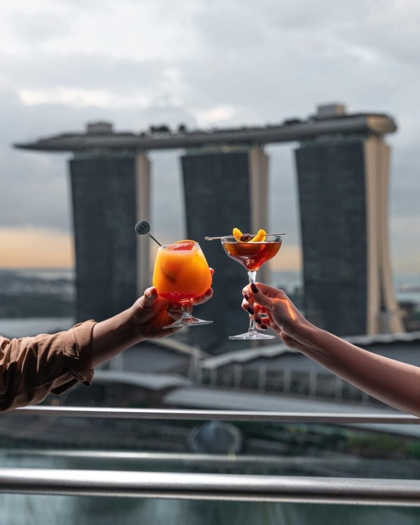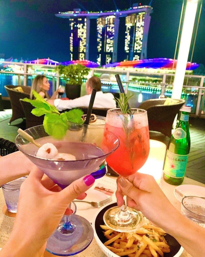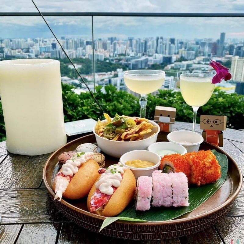 Best believe the views are spectacular, as you’ll get sights of Gardens by the Bay, Singapore River, and an impressive city skyline. Situated in a luxurious district, its cuisine and drinks are on the higher end, with cocktails priced from S$27.