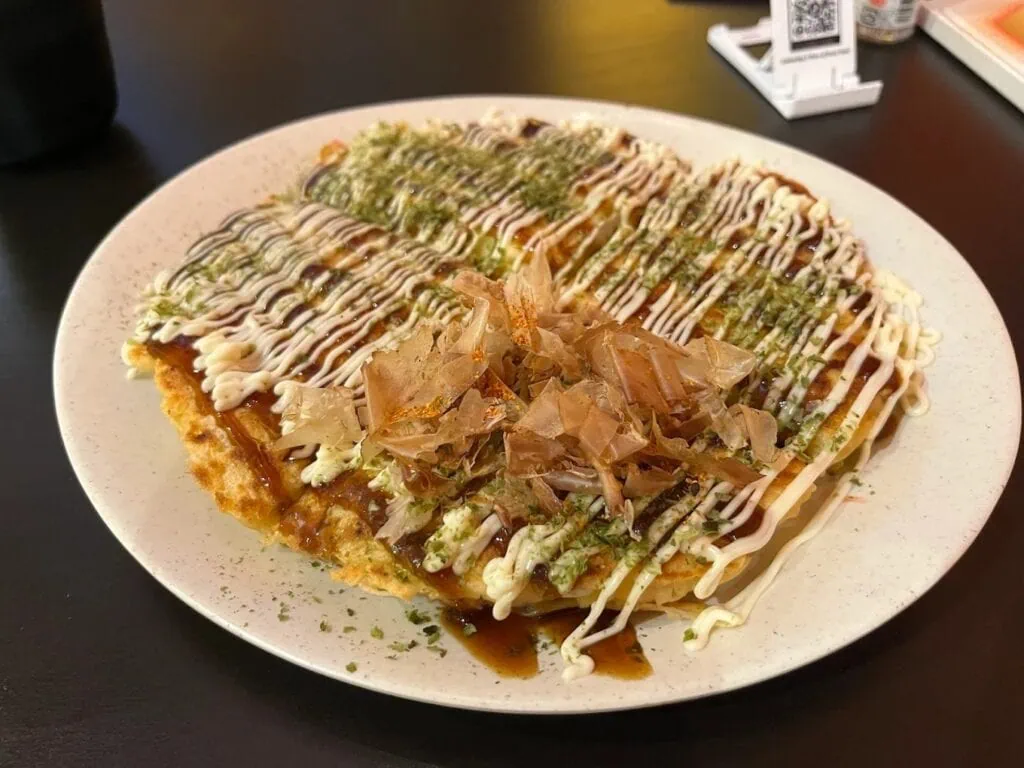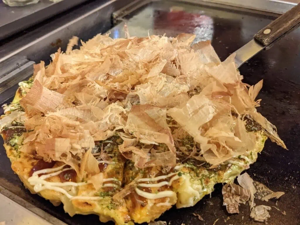 After cooking, the Okonomiyaki is usually topped with a special savoury sauce, mayonnaise, and dried bonito flakes.