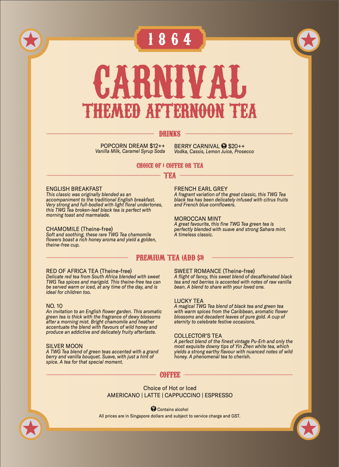 Completing the menu on-theme with two drink selections, the Popcorn Dream and Berry Carnival are garnished to maintain the whimsical atmosphere. Served with bright, bold colours and frilly toppings, it’s definitely an “eyes eat first” moment.