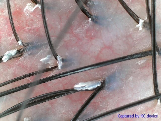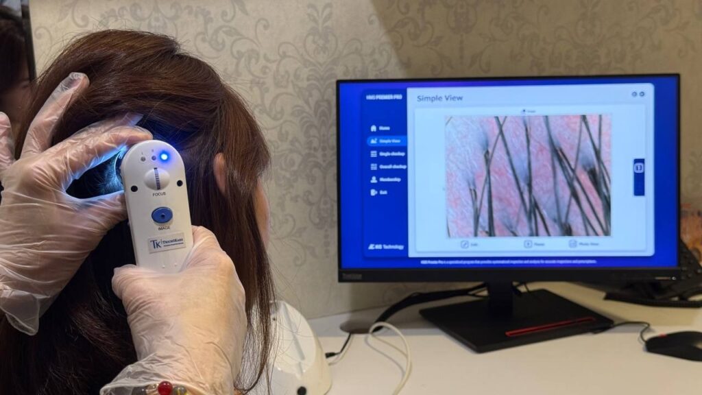 As she began her therapy session, a personalised scalp scan analysis was first performed by a TK TrichoKare consultant. With the 200x magnified scalp scans shown on screen, the consultant skilfully identified and explained what was affecting Yan’s scalp condition. Even with her daily hair washing routine, the results showed severely inflamed skin, ridden with flakes on an oil clogged scalp.