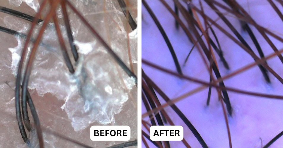 From the first scalp scan, you’ll see the condition of your scalp—inflamed, clogged and dry. After the treatment, the second scan reveals a noticeable difference where your scalp appears less inflamed, cleaner and far more refreshed.