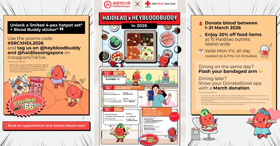 Simply dine in and post your set on Instagram or TikTok, and tag @haidilaosingapore @heybloodbuddy alongside the hashtag #SRCXHDL2026. Additionally each set comes with a limited edition co-branded sticker for you to show how you’ve done your part in this initiative.