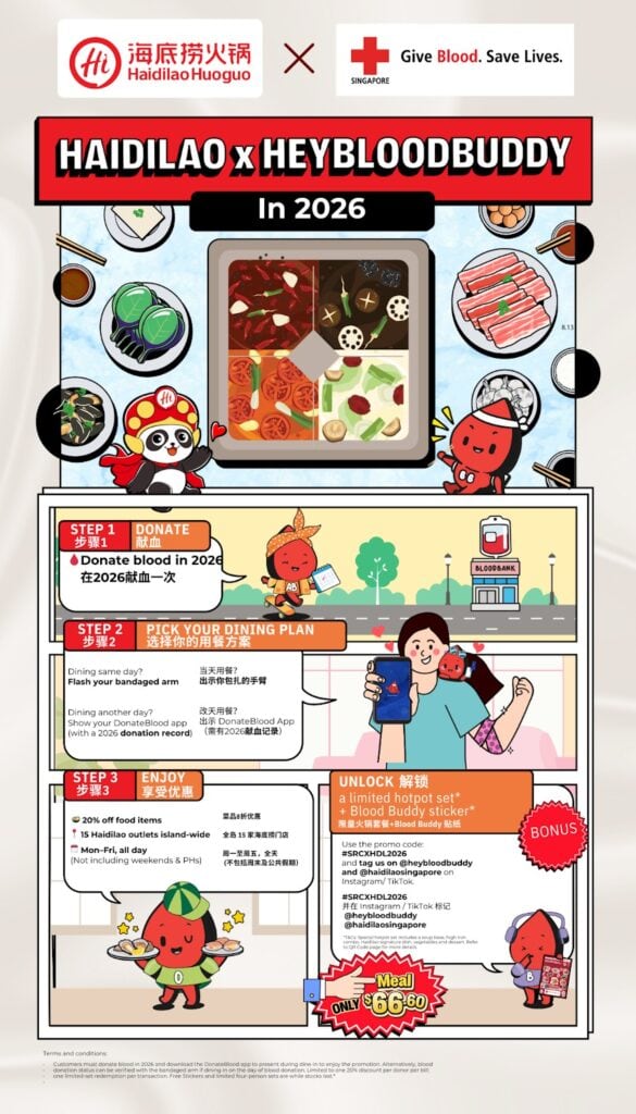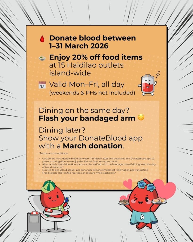 Once you’re done with your blood donation session, simply flash your bandaged arm at any Haidilao Singapore outlet to gain 20% off food items at Haidilao! If you’re looking to dine another day, this promotion still applies when you show your 2026 blood donation record through the DonateBlood app.