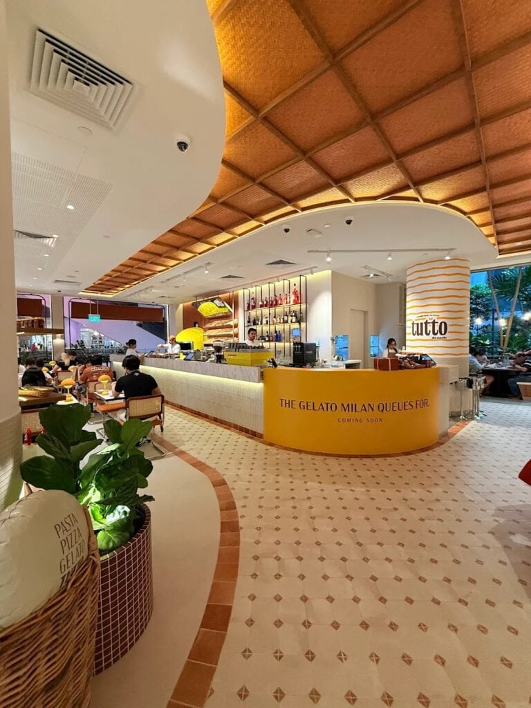 The Italian bistro made its debut in Jewel Changi Airport earlier this month, and its entrance sets a polished tone with white and grey hues, gold accents, and a backlit sign. Step inside, though, and the mood shifts into something far more playful.