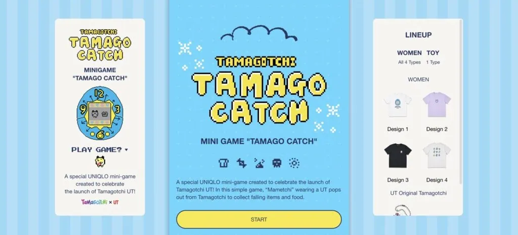 In addition to this Tamagotchi, a special website has also been launched, which includes UT original mini-games to enjoy. The game plot starts with Mametchi, who pops out from the Tamagotchi shell. While navigating the website, guide Mametchi as he gathers falling items and food while wearing his UT apparel.