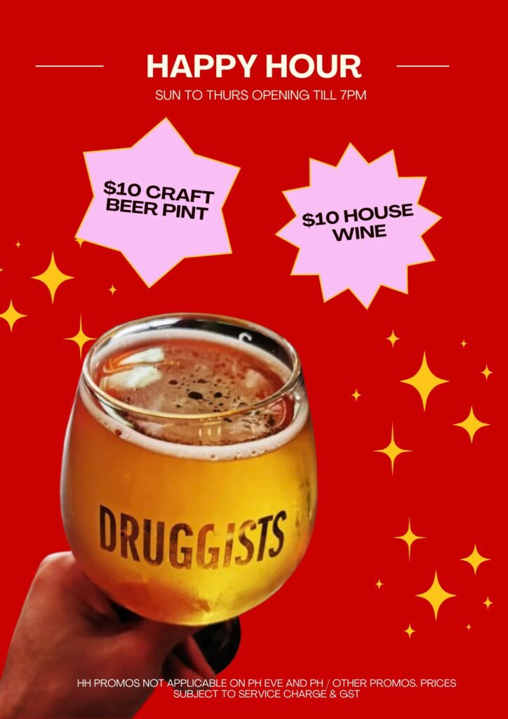 Druggists’ S$10 house wines and craft beer pints are available every Sunday to Thursday, until 7pm.
