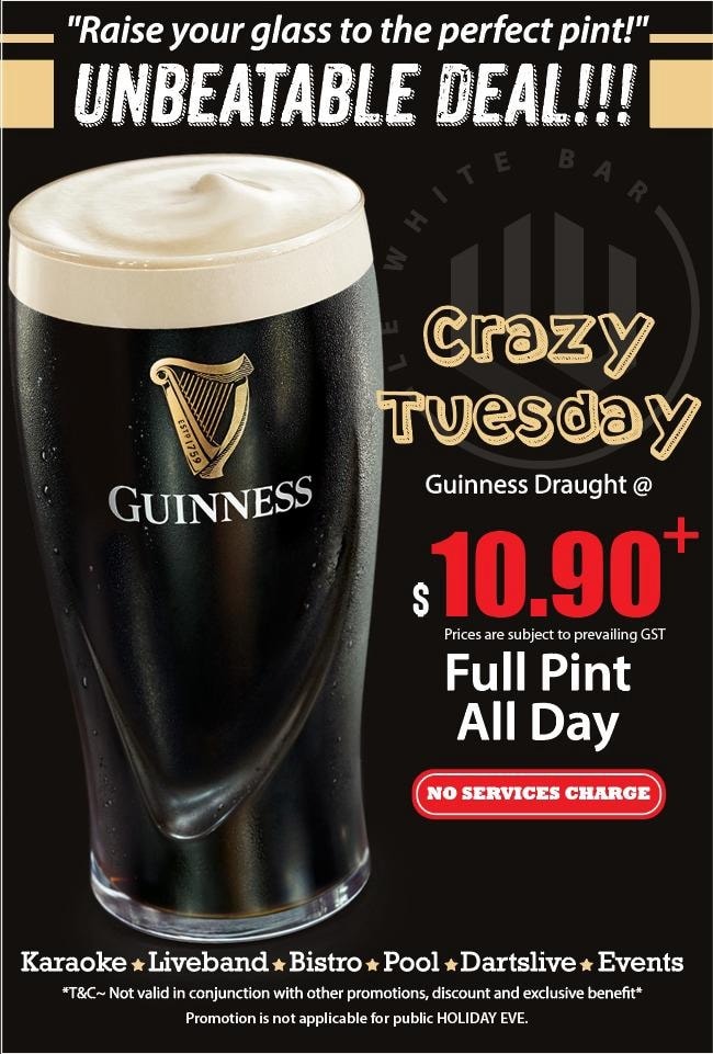 Tuesday : S$10.90+ Guinness Pints @ Le White Bar