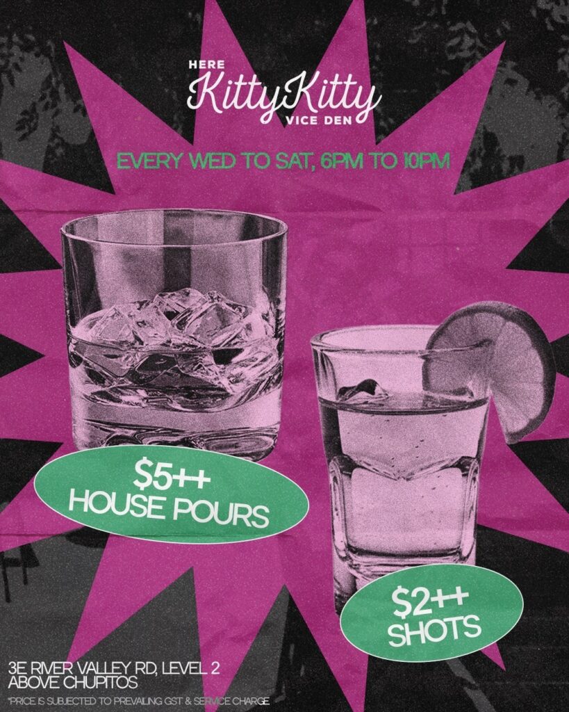 Find Here Kitty Kitty’s S$5++ house pours and S$2++ shots every Wednesday to Saturday from 6pm to 10pm, and its S$20 liquid buffet on the same days from 10pm to 1am.