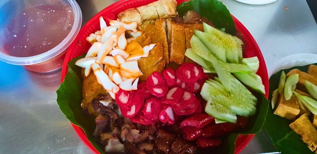 Customers can grab a pair of tongs and pile their plates with their favourites. The selection is then deep-fried in a massive wok, cut into bite-sized pieces, and served piping hot with a side of chilli and sweet sauce. To complement the fritters, the store sells Bee-Hoon, whose mellow flavour and soft texture perfectly balance out the flavourful fried bites.